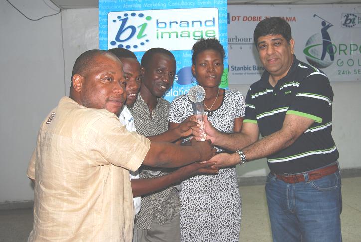 Mwenyekiti wa bodi wa Kampuni ya Brand Image Tanzania, David Shambwe akiwakabidhi zawadi washindi wa jumla, Shiva Image walioibuka washindi wakati wa mashindano ya Makampuni mbalimbali ya mchezo wa wa Golf Dar es Salaam wenye lengo la kufahamiana haswa kibiashara.
